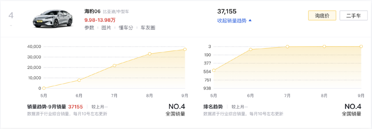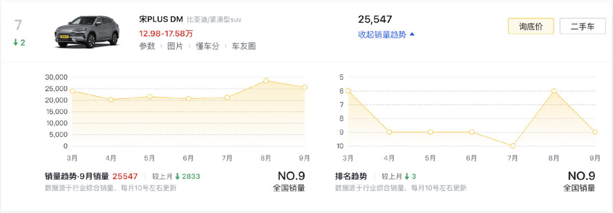 比亞迪秦PLUS DM-i(第九名/24608輛)在秦L、海豹06上市后,不再擁有那種統治級數據,但就在它所在的細分市場中,依舊沒有其它產品能威脅到它的地位。