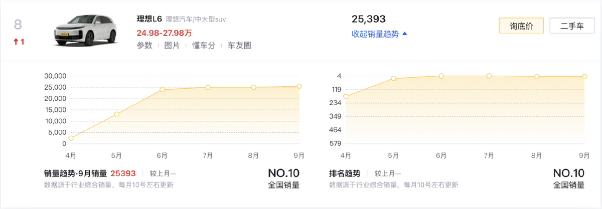 理想L6(第八名/25393輛)作為TOP10當中唯一一款高端產品(價格門檻在25萬元以上),其瞄準了高端家庭用車市場的核心訴求,在僅提供兩種配置的情況下,無論是智能座艙、高階智駕,還是超高規格的舒適配置、底盤懸架等,都讓大量家庭用車能夠以遠低于傳統豪車的價位,享受到超標準的用車體驗。