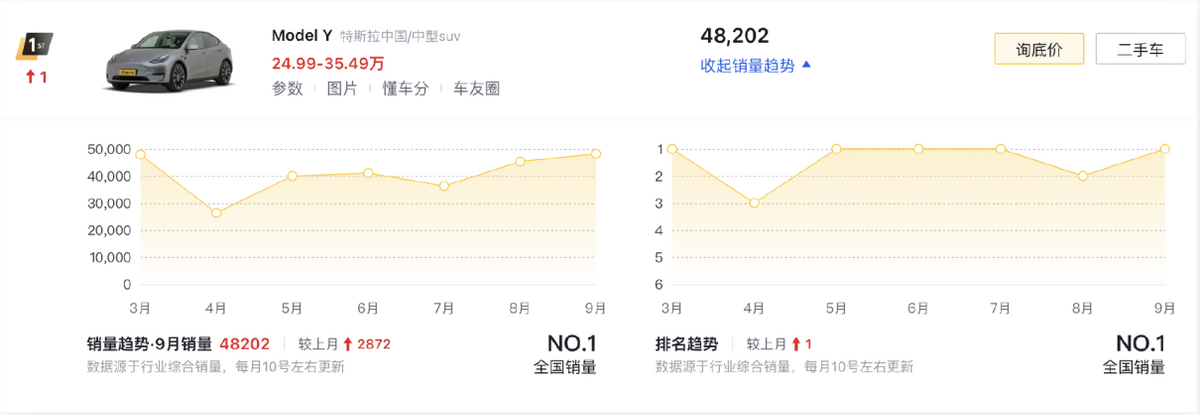 盡管新勢力、傳統車企輪番沖擊,可特斯拉Model Y(第一名/48202輛)的號召力依舊突出,它無論是在極簡化的外觀,還是智能前衛的座艙,都讓其延續著自己的固有優勢。最重要的是,車輛不光是在動態性能方面保持著領先性,在智駕方面依舊屬于第一梯隊,想要挑戰它的地位不會太容易。