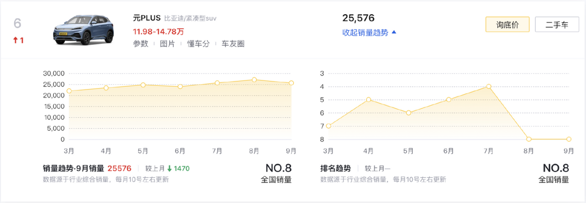 第六與七名也被比亞迪所占據,它貢獻了比亞迪元PLUS(第六名/25576輛)與宋PLUS DM-i(第七名/25547輛)兩款SUV車型,前者以短途用車為主,作為過去元EV的升級版本,元PLUS邁入了緊湊型SUV市場,并通過e平臺3.0,在核心硬件方面展示出了同級優勢;而宋PLUS DM-i則在更新中迎來了第五代DM技術,進一步降低能耗成本的情況下,比亞迪的pDiLink+DiPlot兩套智能系統,雖然在這樣的產品中不是高階版,但也能夠在用車娛樂、安全輔助方面起到關鍵作用,加上換代后更前衛的內外造型,這2萬級月銷應該還有上升空間。
