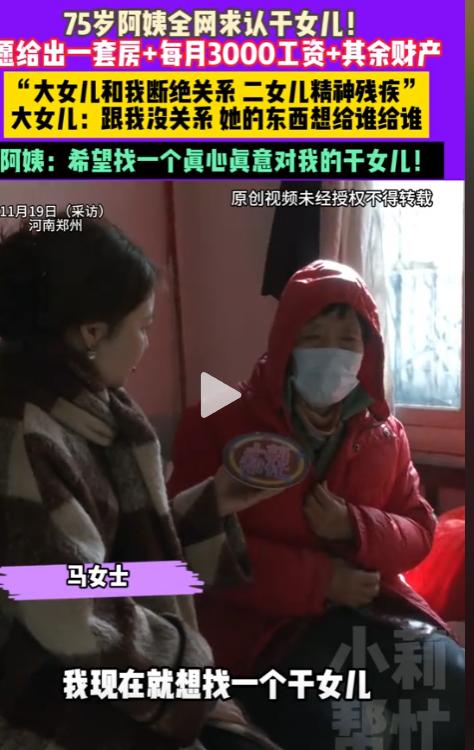 血濃于水”四字,在鄭州的馬阿姨身上沒能體現出半點溫情,她明明有兩個女兒,可因為種種原因,兩個女兒都不管她,無奈之下,75歲的她全網求認干女兒,給一套房和40萬元財產,還有每月三千元工資的豐厚待遇。